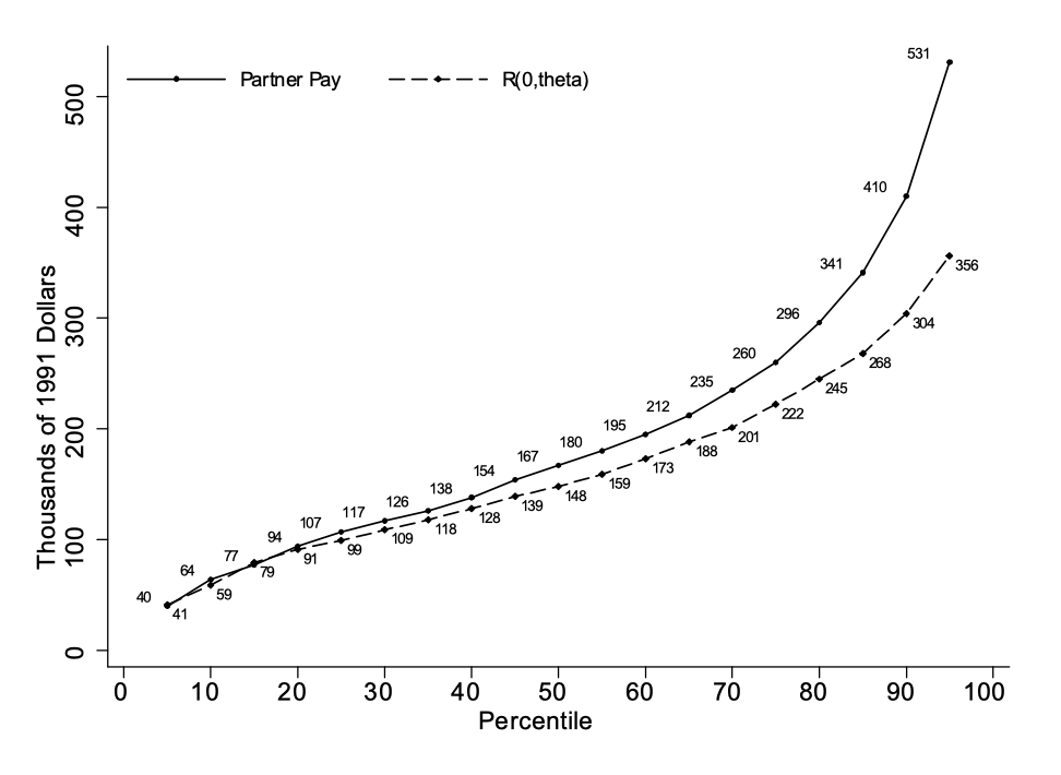분석 결과, 어소시에이트에게 일을 분담시키는 파트너들이 그렇지 않는 파트너들에 비해 20퍼센트 내외로 소득이 높은 것으로 나타났다. 또한 업무 위임의 스킬이 뛰어난 파트너 변호사들(95퍼센타일)의 경우에는 최소 50퍼센트 더 많은 수입을 벌어들였다. 어소시에이트를 고용한다는 것은 파트너에게 그만큼 비용(어소시에이트의 연봉, 복리후생비, coordination cost 등)을 부담시키지만, 결국 파트너가 얻는 이득이 그보다 크다는 점을 알 수 있다. 왜냐하면, 어소시에이트에게 본인의 일상적 업무를 위임할 경우 의뢰인(고객)에게 좀더 많은 시간을 집중할 수 있기 때문이고, 의뢰인은 그에 따라 수임료를 더 많이 지불하기 때문이다. (아래 그래프 참조)