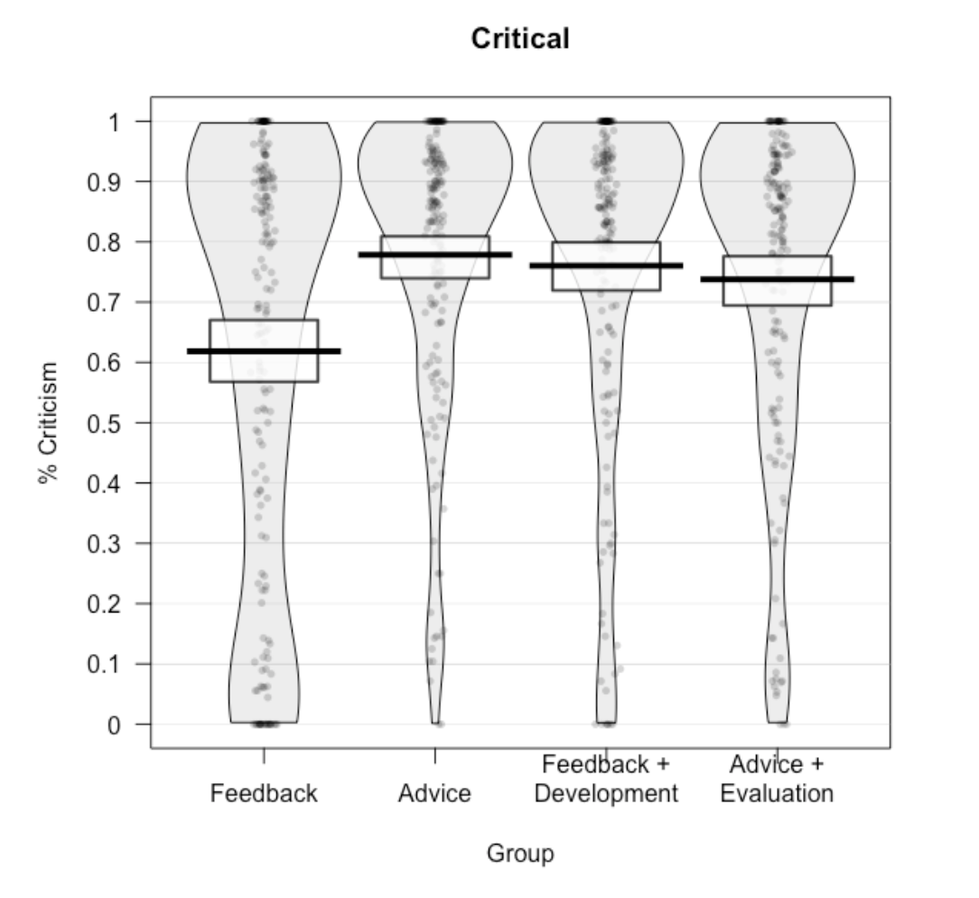 예를 들어, 피드백 요청 그룹은 "이 사람은 지원조건을 아주 충족시키고 있다. 아이들과 함께 한 경험이 있고, 가르치는 스킬을 적절하게 갖추었다"는 식으로 두루뭉술한 코멘트를 쓴 반면, 조언 요청 그룹은 "나라면 아이들을 가르쳤던 과거의 경험을 구체적으로 서술하겠다. 본인의 '가르치는 스타일'을 자세하게 서술하고 왜 그런 스타일을 가지게 됐는지 더 설명하면 좋겠다. 왜 아이들을 가르치고 했는지, 무엇을 최종 목표로 생각하는지 등을 추가하면 좋지 않을까?"라는 식으로 지원서에서 무엇이 부족한지, 어떻게 지원서를 보완할지를 상세하게 코멘트하는 경향이 상대적으로 강하게 나타났다. 통계적으로, 조언 요청 그룹은 피드백 요청 그룹보다 '개선 영역'을 34퍼센트 많게 코멘트하고 '개선 방법'을 56퍼센트 많게 제안했다.