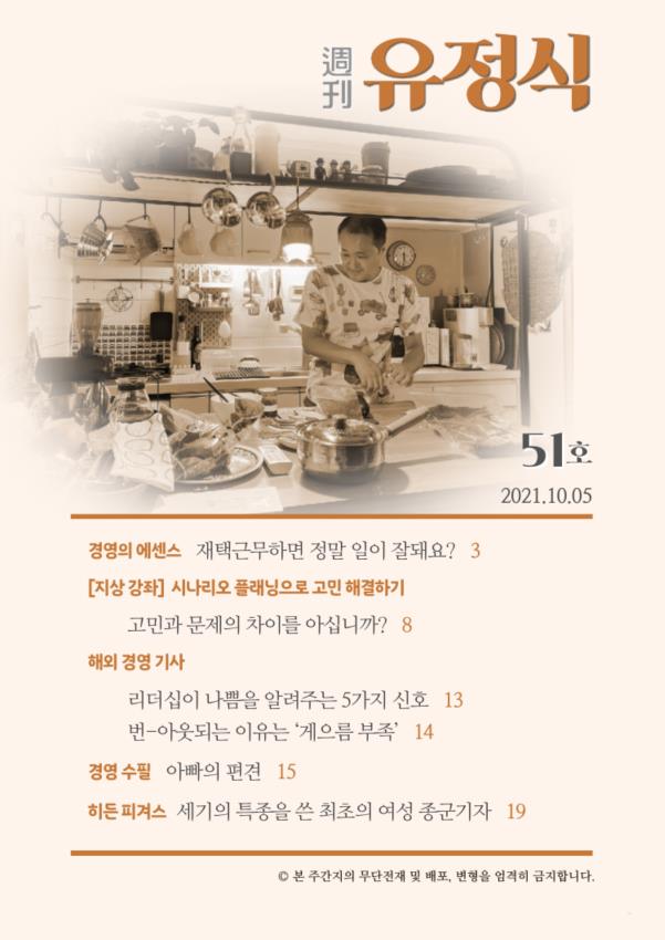 | [경영의 에센스] 재택근무하면 정말 일이 잘돼요? [지상 강좌] 시나리오 플래닝으로 고민 해결하기 고민과 문제의 차이를 아십니까? [해외 경영 기사 ] 리더십이 나쁨을 알려주는 5가지 신호 번-아웃되는 이유는 ‘게으름 부족’ [경영 수필] 아빠의 편견 [히든 피겨스] 세기의 특종을 쓴 최초의 여성 종군기자 |