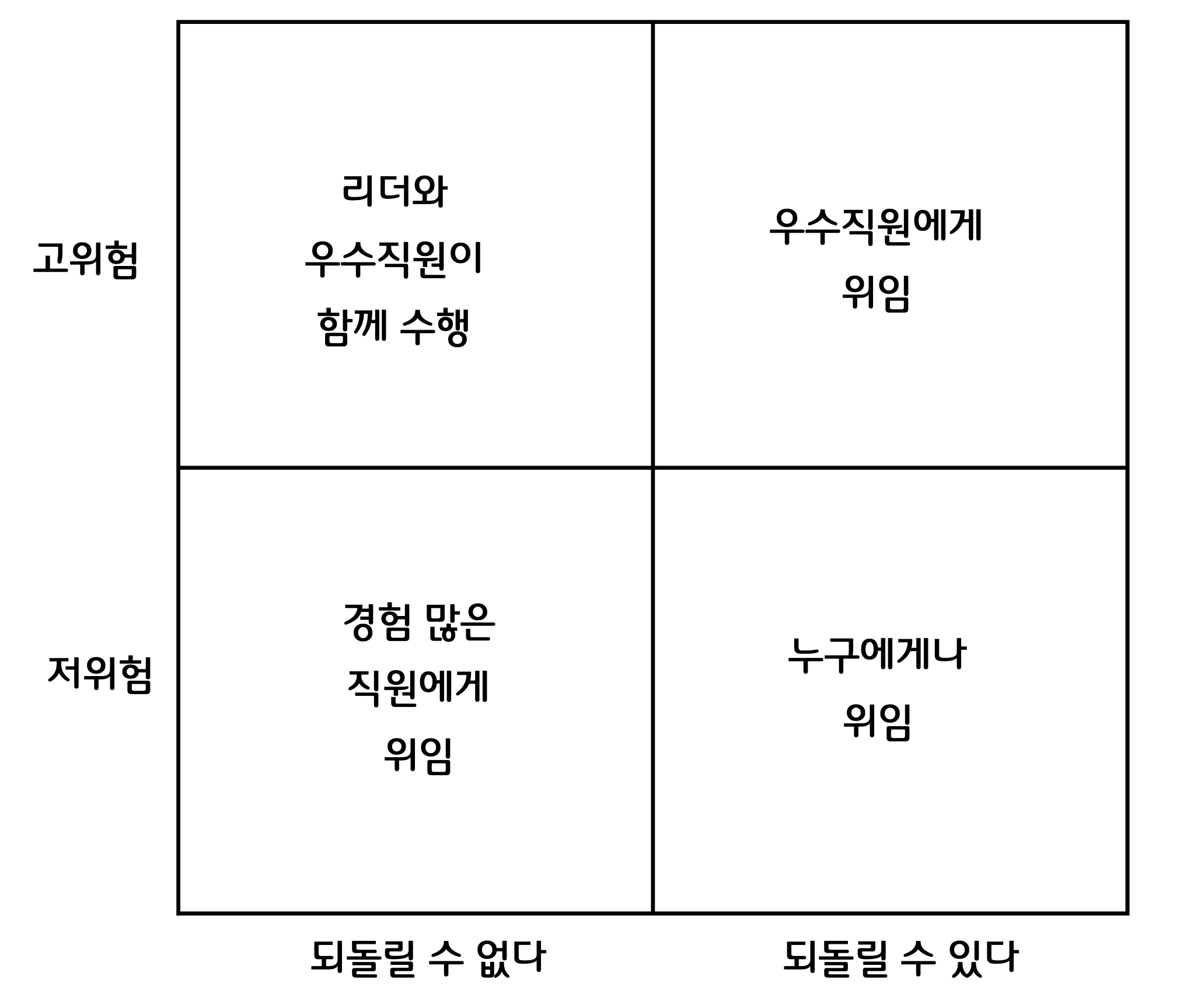 위험이 높고 되돌릴 수 있는 일이라면 팀 내에서 우수한 직원에게 그 일을 맡김으로써 우수직원의 역량을 더욱 키우거나 '일종의 테스트'를 할 수 있는 기회로 삼을 수 있을 겁니다. 하지만 위험이 크니까 리더가 지속적으로 코칭하고 피드백해야겠죠.