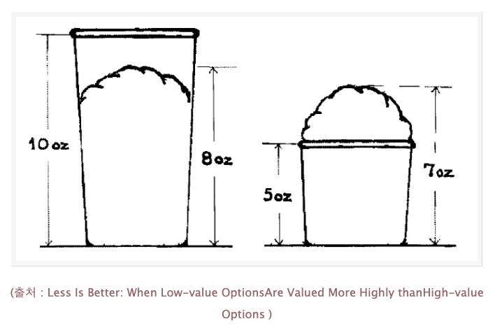 누군가가 여러분에게 이렇게 묻습니다. "두 개의 아이스크림을 구입한다면 각각 얼마에 살 용의가 있습니까?" 큰 컵에 아이스크림이 가득 담기지 않았지만 용량으로 보면 작은 컵보다 많기 때문에 큰 겁에 컵에 더 많은 돈을 지불하는 것이 당연하겠죠. 심리학자의 실험에서 미국 중서부에 위치한 모 대학교 학생들은 큰 컵에 평균 1.85달러를 지불하고 작은 컵에는 평균 1.56달러를 지불하겠다고 답했습니다.