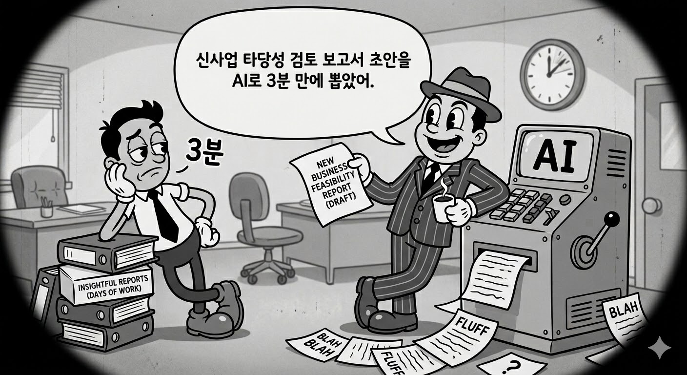 "신사업 타당성 검토 보고서 초안을 AI로 3분 만에 뽑았어. 프롬프트를 기가 막히게 짰거든. 남들 하루 걸릴 일을 커피 한 잔 마실 시간에 끝냈지."