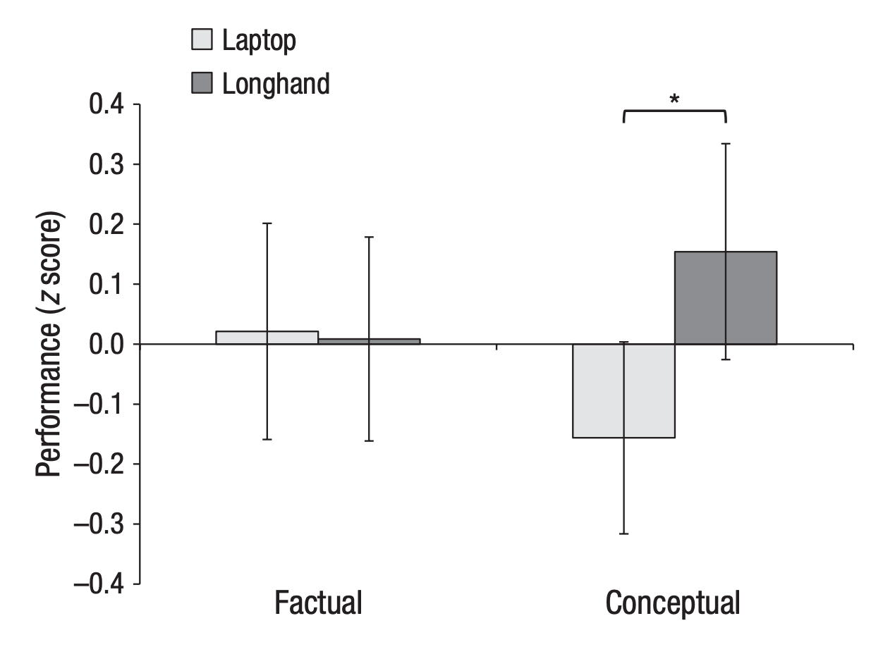 하지만 노트북PC로 타이핑하면 손으로 글씨를 쓸 때와 비교하여 강의나 회의의 전체적인 개요와 컨텍스트(context)를 파악하기가 어렵다는 연구 결과가 있다. 프린스턴 대학교의 팸 뮐러(Pam Mueller)는 두 가지 방법으로 TED 강의 내용을 필기하게 한 다음, 실험 참가자들에게 강의에 대한 퀴즈를 풀도록 했다. 그랬더니 강의에서 나온 개별적인 사실들을 기억해내는 정도는 두 방법 사이에 차이가 없었다. 하지만, 강의 전체에 내재된 기본 개념을 설명하라는 문항에 대해서는 손으로 필기를 한 참가자들의 점수가 확실히 좋게 나타났다(아래 그래프 참조).