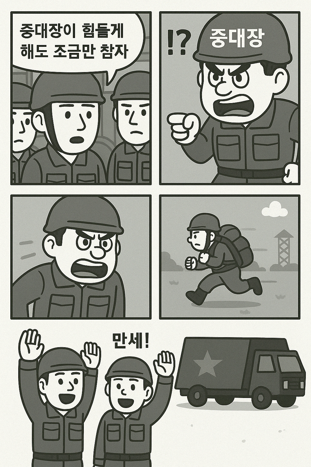 하루는 제가 취침점호를 하다가 중대장에 관한 이야기를 꺼냈습니다. 중대장이 여러분을 힘들게 해도 조금만 참자, 라는 취지로 말했던 것으로 기억합니다. 그런데 그 말을 지나가던 중대장이 들은 모양이에요. 전 바로 완전군장을 한 채 연병장을 뛰어야 했죠. 다음날에도, 그 다음날에도 저는 하루종일 연병장 뺑뺑이라는 얼차려를 받았는데, 한여름이라 얼마나 힘들던지 나중에 다리에 쥐가 날 정도였습니다. 제가 그리 심한 뒷담화를 한 것도 아닌데 너무한다 싶은 마음에 저는 그 작자가 빨리 다른 곳으로 전근되기를 빌고 또 빌었죠.